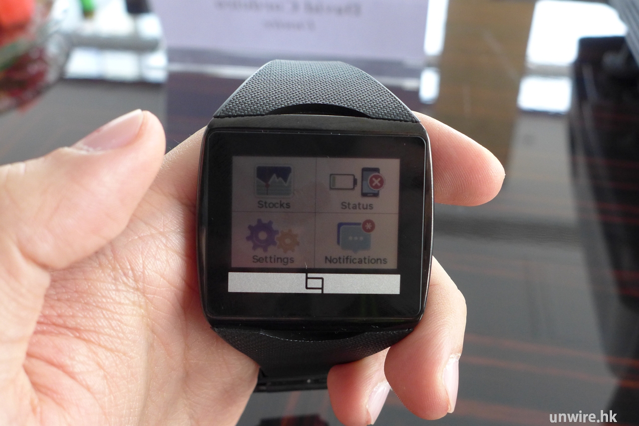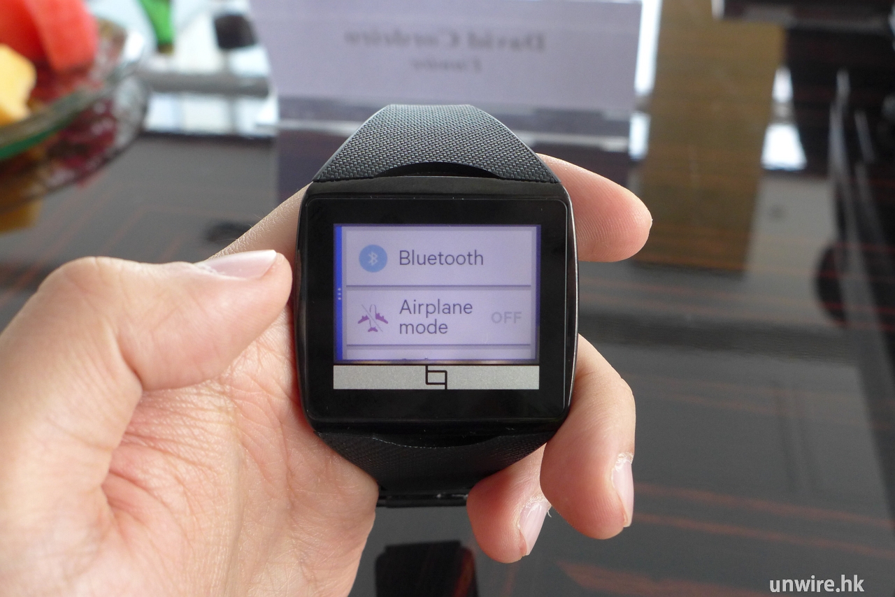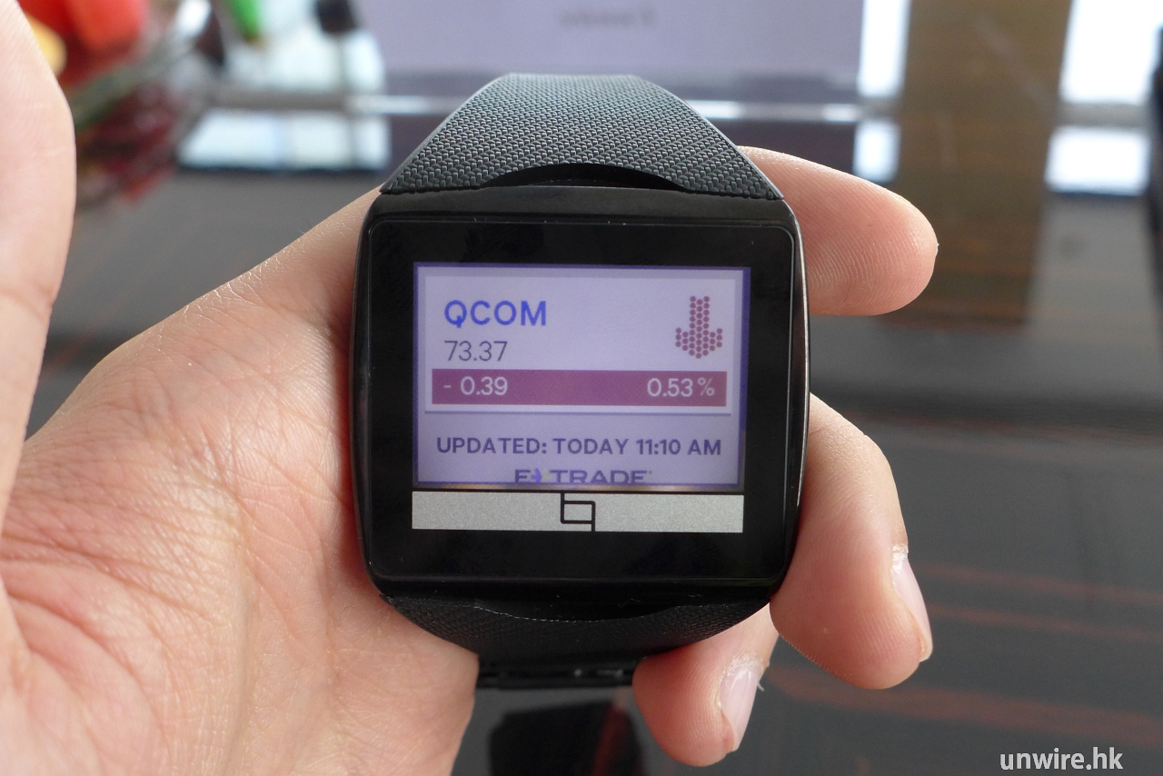Qualcomm Toq 這個屏幕有 1.55 吋使用 Mirasol IMOD 技術,特色是彩色、細緻,強光下仍然清晰,但平常收看有點略暗,收看文字可能要啟動背光。操作方面,介面以 4 格方式展示,上下拉動可收看更多內容,左撥則是上一頁,配合錶帶的 Home 鍵,操作都算直覺,而它提供了通話紀錄、日曆、音樂播放、天氣及提示等標準功能,這方面沒有太大驚喜。此外,小編試玩期間找不到錶內有中文語言選擇,而且現場亦無法嘗試顯示中文,因此中文支援亦成疑問。