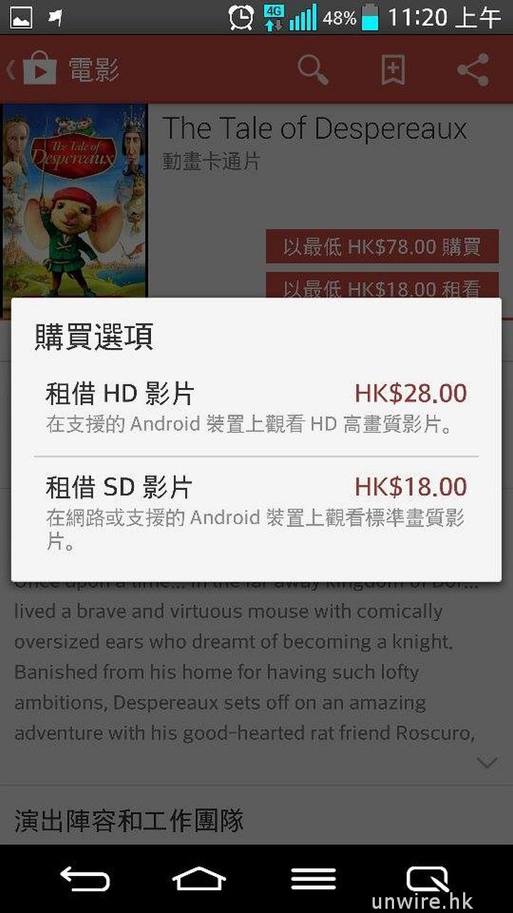 ▲ Step 2: 選擇租借或是購買時,會彈出 SD (標清) 或 HD (高清) 畫質選項,其次價錢上都有很大差別。