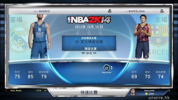 以往玩 NBA 後難想像可以控制 NBA 以外的球隊,不過《NBA 2K14》破天荒收錄了 14 支讓歐洲籃球聯賽 (Euroleague Basketball)頂級球隊,大家可以隨時用來挑戰 NBA 球隊,當然亦可以好似下圖般,上演一場皇馬對巴塞 ( 籃球版)的國家打呲呢!