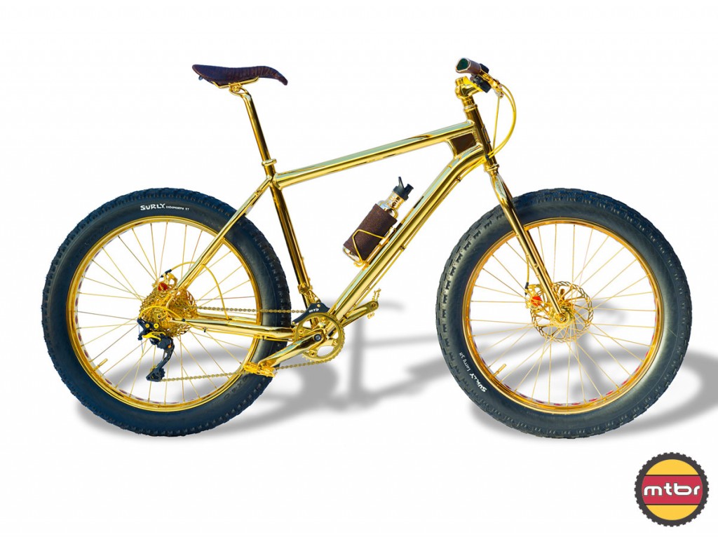 一部爬山單車可以賣幾貴?美國的 The House of Solid Gold 最近就推出了 24K 金單車。這部 24K 金單車,共花了 750 小時以人手打造,全車以 24K 金電鍍,配合共 6 卡的 600 顆黑鑽石,500 顆藍寶石(共 4.5 卡)和啡色鱷魚皮座椅,就連水樽都是鍍金,並且以魔鬼魚皮裝飾。