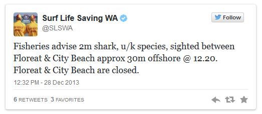 科學家早前為澳洲海岸附近的 400 條鯊魚作出了標記,當牠們游近海岸時會自動經由 Twitter 發出警報,令大家知道鯊魚大概行蹤,減低對泳客或滑浪者的傷亡機會。除了知道鯊魚是否靠近外,也會告知鯊魚大小及種類消息,目前該 Twitter 已有超過 15,000 名用家跟隨,需要到澳洲沿海區域活動的用家,不妨也哏隨他們的 Twitter 吧!