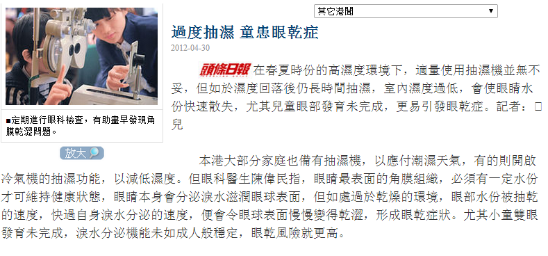 抽濕機使用過度,令濕度過低,會把人的眼睛水分抽乾,淚水分泌來不及滋潤眼球,最終出現眼乾症。此時眼球表面的角膜有機會因乾涸而剝落,形成角膜破損及發炎。