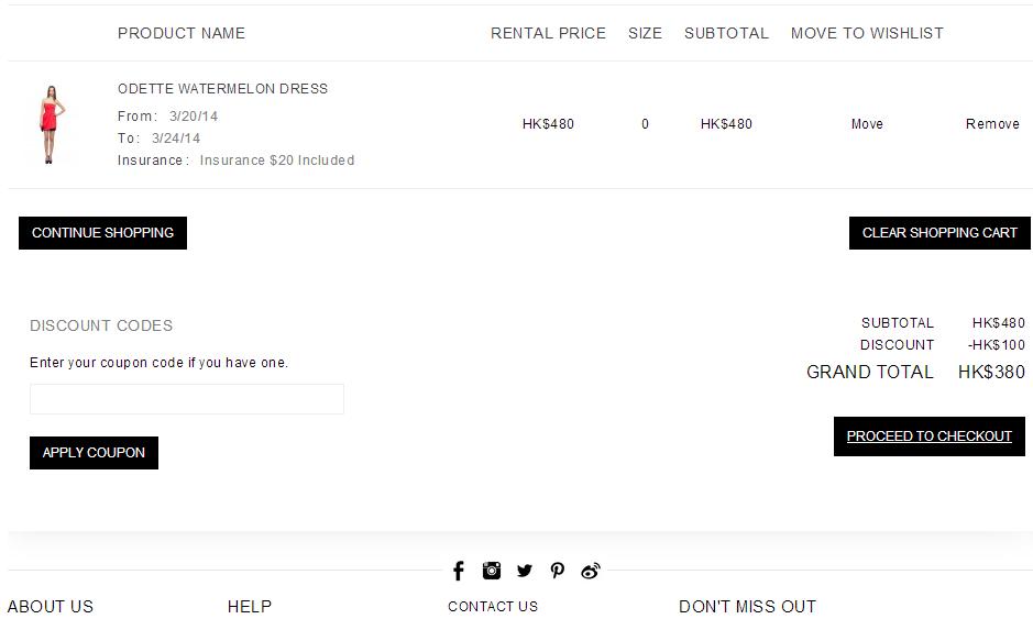 暫時 Yeechoo 內的裙款不多,Shan Shan 表示在這個月內會加入一批新裙,以後更可能會加入租借配件的服務。在 3 月內登記為 Yeechoo 會員在租裙時可減 HKD $100,優惠都要在 3 月內使用,除此之外還有其他優惠,大家可以在網站內看到;一次租借期為 4 天,即今天借裙明天去 party,後天還可休息一下,再下一日先去還裙,而延長租借期就要加錢,另外只要在早上 10 時前在網上完成租裙的程序,都可以即晚送件。