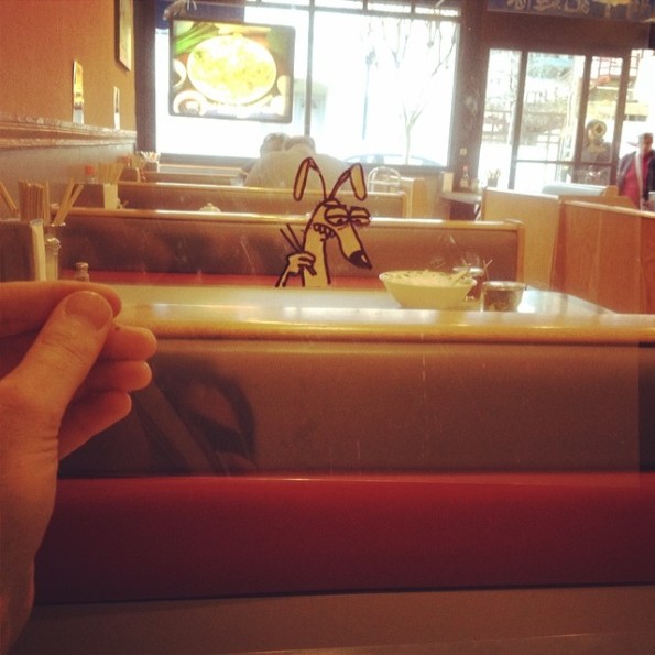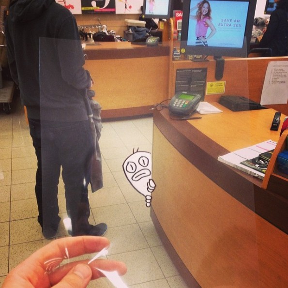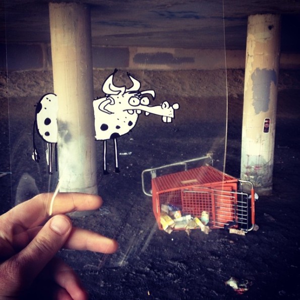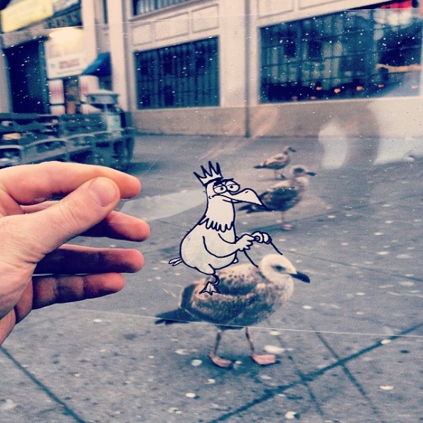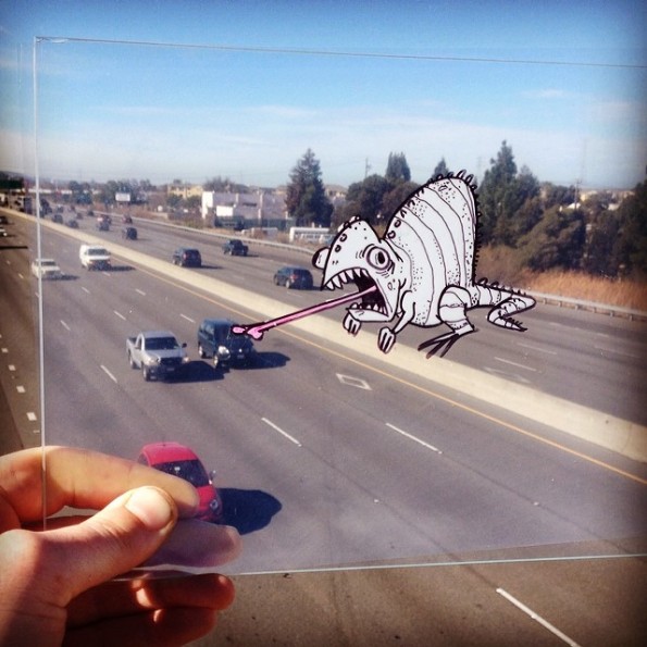 這些攝影作品,由藝術家 Marty Cooper 創作,他在透明膠片上,利用塗改液和黑色箱頭筆,畫上不同的卡通角色,然後放在鏡頭前面,與背景融合在一起。聽起來非常簡單,但要製作出與現實配合得天衣無縫的作品,也不是容易的事。逗趣的卡通角色,在這片透明膠片上,栩栩如生的配合到背後的現實,也不能不佩服 Marty Cooper 豐富的想像力。