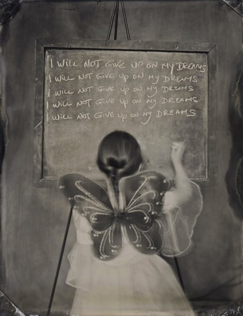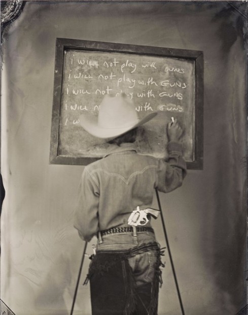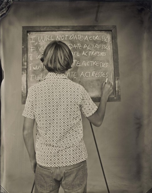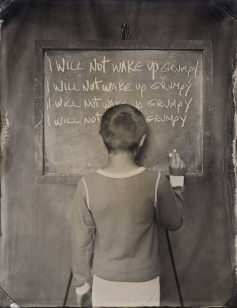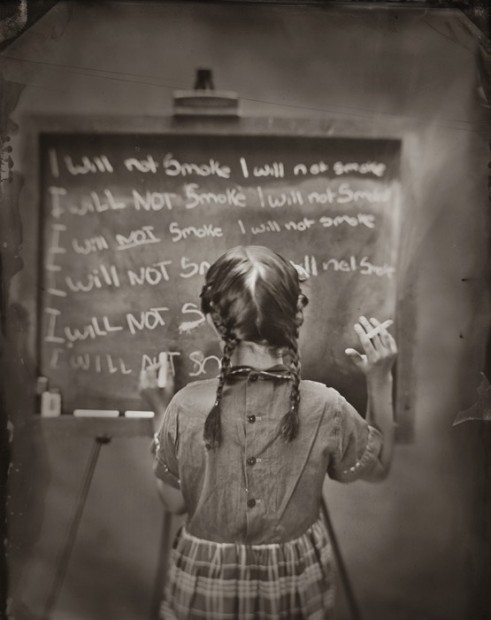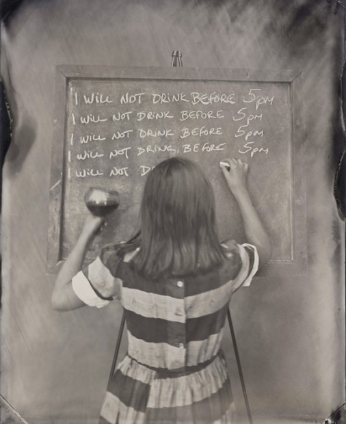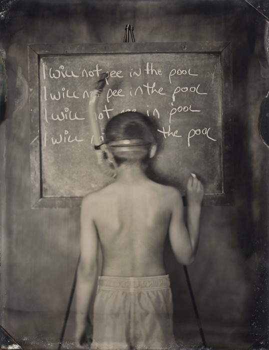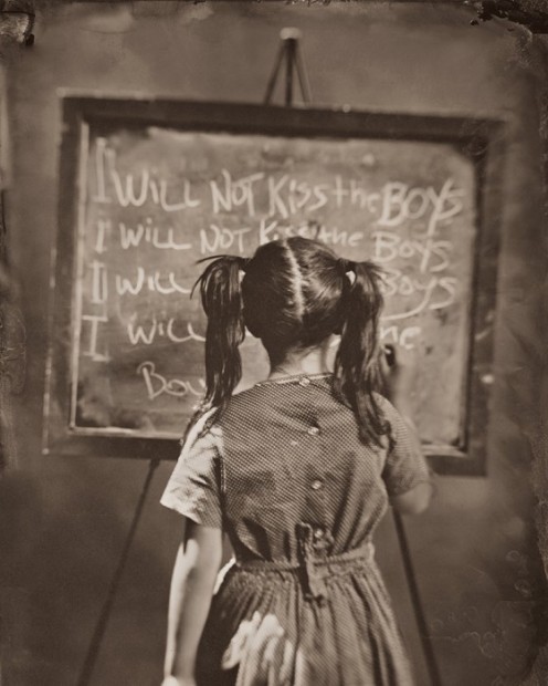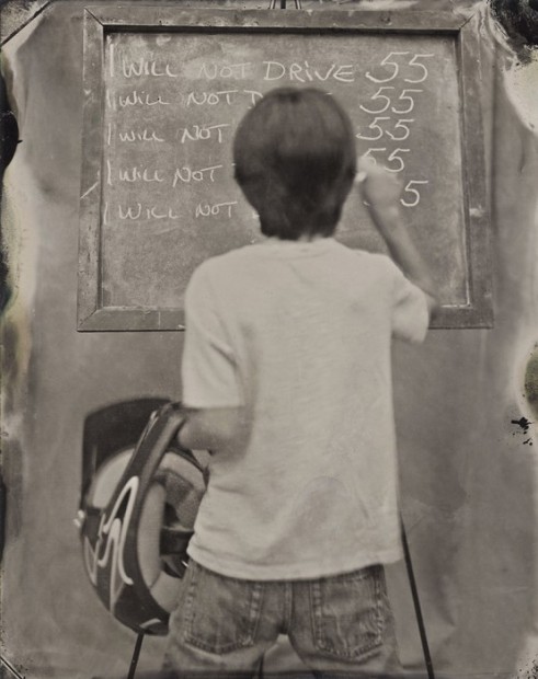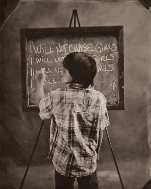 名為「Vice(罪惡)」的這個系列,使用復古的大片幅相機和濕板方式拍攝,色調偏灰啡色,而照片中的小孩,都穿著不同的服裝,在黑板上罰抄著自己不會再犯什麼的字句。這樣的畫面,讓人想起以前頑皮地犯規後,一邊扮乖罰抄,一邊已經在想下次要怎樣玩。
