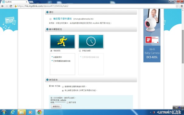 ▲ 設定頁中有通知功能,啟動移動偵測功能時,一有異常,系統會以電郵方式通知用家。