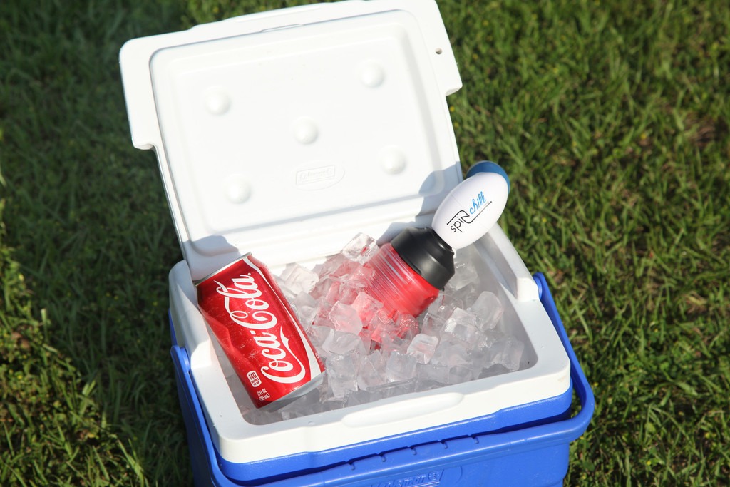 Spin Chill 是一個用 4 枚 AA 電池推動的摩打,摩打的前端有一個吸住罐裝飲品的吸嘴,將罐裝飲品吸實後放進冰水內轉動 60 秒,利用物理原理,令室溫的飲品馬上急速冷凍,而且就算經過旋轉,飲品打開時亦不會噴出,把 Spin Chill 帶去 BBQ 最方便不過。售價:29.99 美元