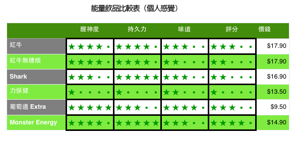就小編個人感覺,6 隻能量飲品之中,Monster Energy 嘅特性比較平均,而且整體效力算係最好一隻。不過葡萄適 Extra 先係小編最常飲嘅,因佢以較平價嘅方式提供提神醒腦嘅效果,我只係嫌佢持久力唔算特別強,而且偏甜。值得留意係所有能量飲品對小編多多少少都有啲副作用,好似心跳加速、手震、煩躁、易怒、噁心、胃部不適之類,同埋大家千祈唔好將佢哋溝埋咖啡、酒精同藥物一齊飲,大忌!(雖然小編試過都死唔去,但係身體明顯感覺唔舒服!)