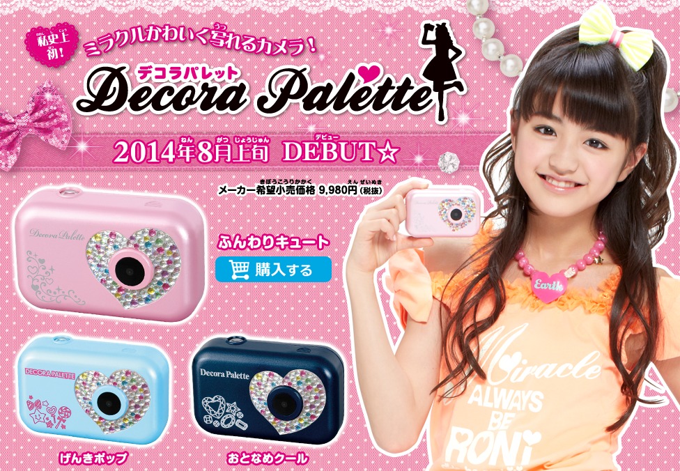 Decora Palette 採用 200 萬像素 CMOS,雖然只能夠拍攝 130 萬像素相片。但就有美顏、化妝、相框和貼紙等好玩功能。Takara Tomy 還和 11 間時裝品牌合作,推出不同的貼紙。讓小學女生都可以「潮」起來。除了內置可拍攝 50 張相片的記憶體,Decora Palette 亦支援 microSD 擴充。Decora Palette 有 3 種顏色選擇,機身均貼滿 bling bling 閃石,非常 Kawaii。售價 9,980 日元(約 764 港元),將會在 8 月中上市。