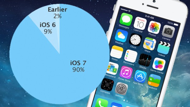 自從去年 9 月發表後,現時已經 iOS 7 有 90% 裝置使用。而 iOS 6 則約有 9%,較舊的版本在 2% 以下。iOS 7 成為了有史以來,升級或採用速度最高的流動系統。對比起 Android 系統,最新的 KitKat 於去年 9 月發表,截至 7 月初的使用率則只有約 18%。
