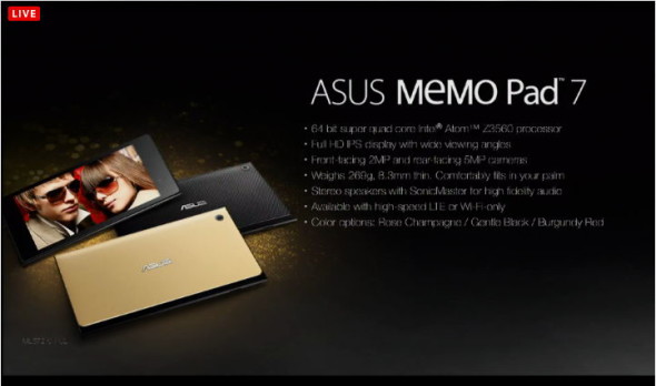 至於 MeMO Pad 7 則採用 Intel 針對行動設備的全新 64 bit 四核心 Atom Z3560 處理器,螢幕為 Full HD IPS 等級,將會提供純 WiFi 版以及 4G 版,相機為前 2MP 、 主 5MP ,重量 289 克,厚度 0.83cm ;華碩特別強調這款平板的結構比過往機種更耐用,採用 50% 鋁合金與 34% 的玻璃纖維材質。 MeMO Pad 7 預計售價為 199 歐元起。