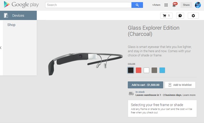 雖然 Google Glass 依然處於 Open Beta 的狀態,售價高達 1,500 美元,而且距離正式版推出還有一段長時間。不過近期 Google 開始在美國開放 Glass 的銷售,消費者只要登入 Play 商店就可以直接購買 Glass Explorer 版本。