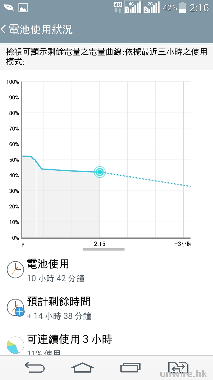 ▲ G3 Dual LTE 依舊用了 Snapdragon 801 於 Antutu 可錄得約 35,552 分。至於電量,小編 主要上網、Facebook 及收看串流新聞,用了約 10.5 小時電池還剩 42%,可見雙卡齊用未見「倒水」問題。(有開省電模式)