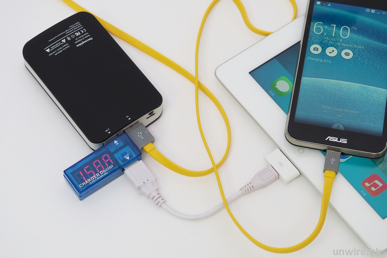▲ 小編 使用 USB 電流檢測器,發現同時為 iPad 及手機充電,2.4A 接口會降至 1.6A 左右。
