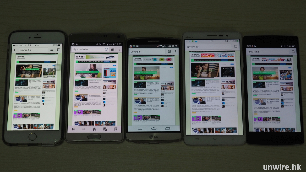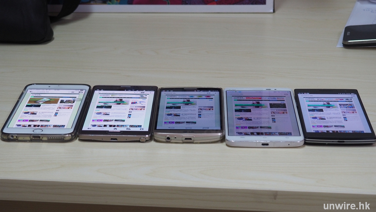 ▲ 除了 iPhone 6 Plus 大家都是 2K 屏幕,細緻度肉眼睇差唔多,但睇清楚亮度都有明顯差別。(左邊數起 iPhone 6 Plus、Galaxy Note 4、G3、Xplay 及 Find 7)