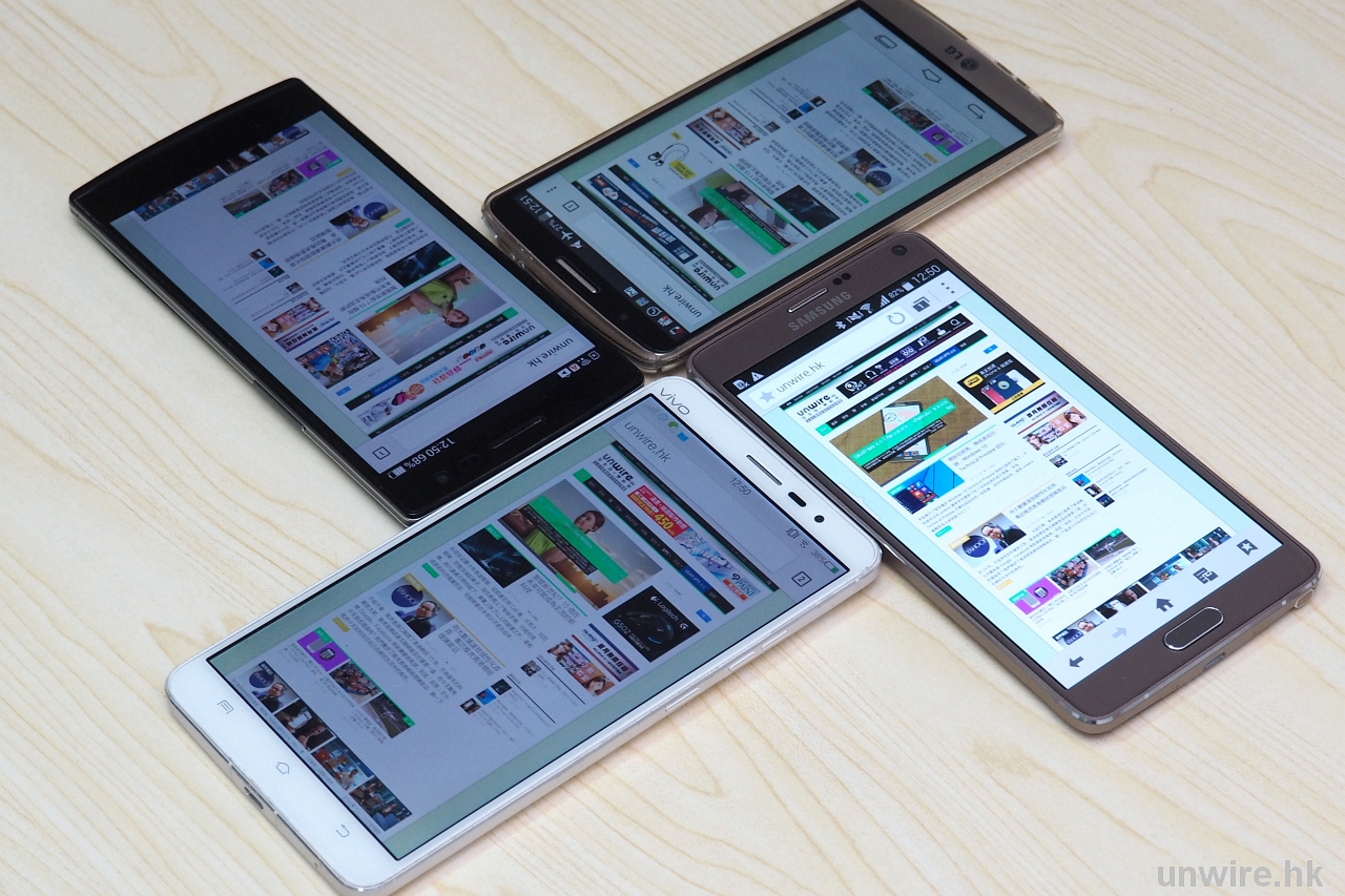 Leo 這次測試的手機,包括有 LG G3、Samsung Galaxy Note 4、Vivo Xplay 及 Oppo Find 7,同場還有 iPhone 6 Plus 作比較。驟眼睇大家都是 2K 屏幕,論細緻其實很接近,即使 Note 4 及 Xplay 尺寸較大,肉眼亦難以辨識細緻度,但如果要計埋介面文字銳利度,那 Samsung 及 LG 就稍佔優。