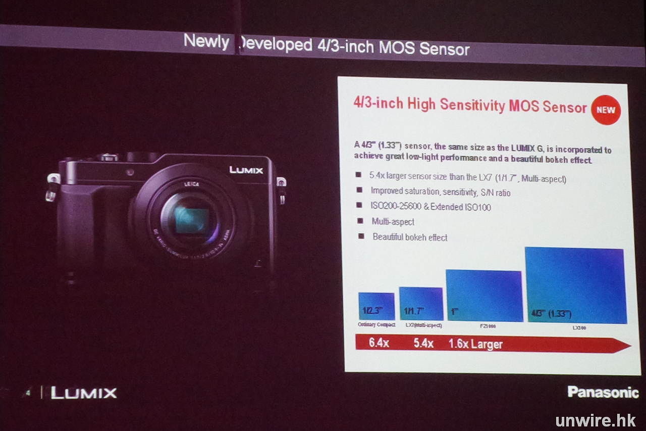 Lumix DMC-LX100(下稱 LX100)咁多人留意全因機內配備比之前更大的感光元件,指的不是 1 吋,而是跟「無反」一樣使用 4/3 吋 MOS,面積同 RX100 的 1 吋 CMOS 比還大 1.6 倍,即相片可紀錄更多細節。雖然它只備 1,280 萬像素,但配合 Venus Engine 處理器,機身最高 ISO 可達 25600,並支持 11fps 高速連拍,機能絕對不遜於「無反」。