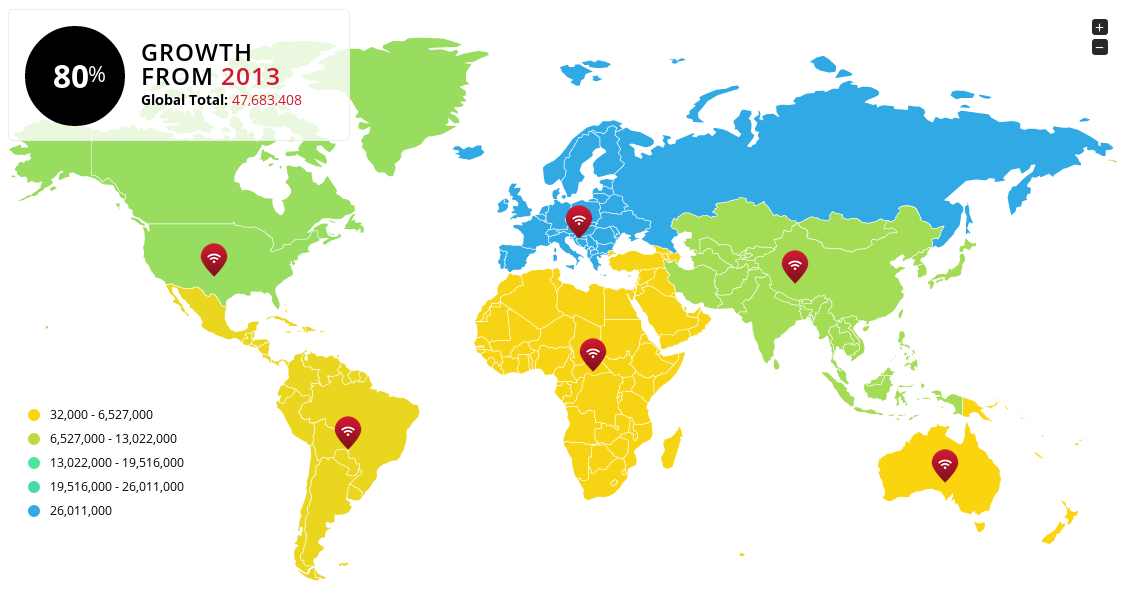 不過分佈並不平均,北美會每 4 人享受到一個熱點;但非洲則是 408 人分享一個。現時歐洲是 Wi-Fi 熱點最密集的地區,到了 2018 年亞洲預計會取而代之。分析認為很多電訊商開始將家用 Wi-Fi Router 加入開放分享功能,在不影響顧客頻寬的情況下,將家用 Wi-Fi 變成公眾熱點,讓其他登記用戶使用。在 2018 年,這類 Homespot 公共熱點可能會大幅上升至 3.25 億個,令到市郊都可以擁有 Wi-Fi 熱點。