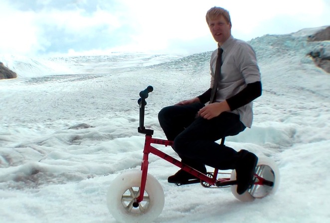 在石屎路上,Ice Bike 的冰輪完全沒有摩擦力,無法抓住路面前進;更恐怖的是不斷碎裂和溶解。Furze 又嘗試在溜冰場試踩,雖然溶解速度減慢,但同樣面對嚴重的跣胎問題。最後他竟然將 Ice Bike 帶到冰川實地試驗,完成他的瘋狂創舉。這其實是時裝品牌 UNIQLO 的一項宣傳企劃,希望藉著 Furze 推廣他們的保暖服飾。
