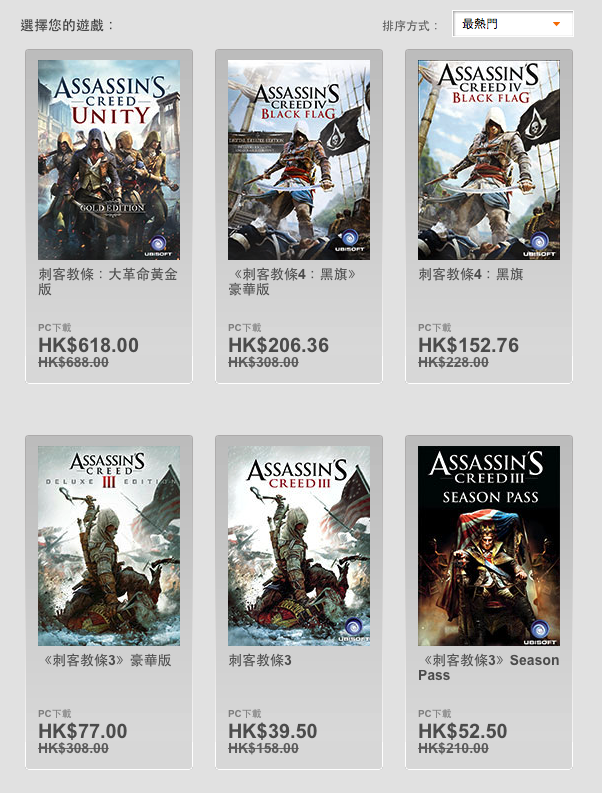 今次 Origin 隨著新刺客推出將舊有作品 (除了 Origin 沒有的 AC1)全數減價,AC2 豪華版只售 HK$20 不到,兄弟會及 AC3 約售 HK$40、而 AC4 則減至 HK$150 左右。Origin 亦有對新作 Unity 的黃金版進行 9 折減價,售 HK$618 比 Steam 預購價亦便宣一點 (普通版就沒有減價了)。