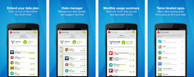 透過將數據經過 VPN 傳送到 Opera 伺服器壓縮,用戶可以節省最多 50% 流動數據,換言之只需要用 Opera Max,用戶的流動數據用量隨時可以增加一倍。Opera Max 能夠將沒有加密和 https 連線以外的影片、圖片和文字等數據壓縮;用戶還可以在 Opera Max 檢視每月數據使用量和將使用大量數據的 App 關閉,限制只在 Wi-Fi 環境下使用。新版本更支援最新的 Android 5.0 Lollipop。
