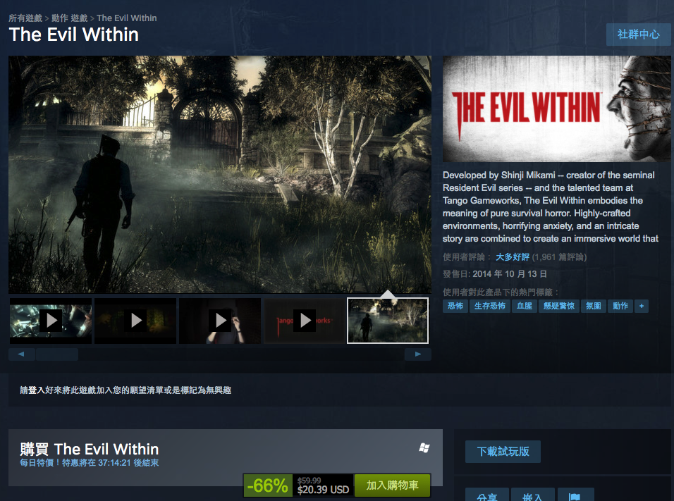 ▲三上恐怖新作 The Evil Within 減至 $20.39 USD。