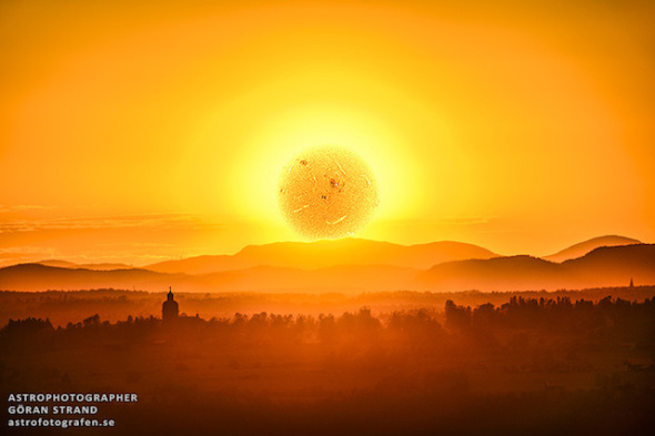 天文攝影師 Göran Strand 利用他的 H-α 望遠鏡,在瑞典附近的 Frösön 拍攝,配合一般的可見光望遠鏡,合成一張與別不同的日落照片,其中使用 H-α 望遠鏡經過縮小再加在一般望遠鏡的照片上。透過 H-α 望遠鏡所看到的,是清晰的太陽表面活動影像,也是 H-α 光譜的特色,合成的效果讓人驚歎,也是靠特別的天文儀器才能拍攝到的情景。