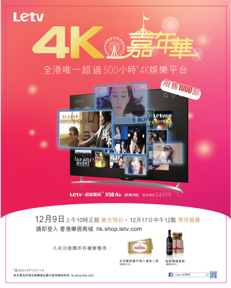 至於搶購方法,就與之前相同,就是在 12 月 17 日 10am 前到 hk.shop.letv.com 預約登記,並在 17 日中午 12 點到相同網站搶購,就有機會以 6 千零蚊獲得一部 Letv X50 Air 連兩年樂視 TV 版內容任睇了。希望今次大家好運,可以搶到一部平靚正的 4K 電視過聖誕啦!