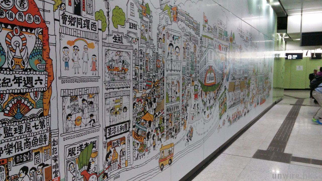 ▲車站牆上印有西環海岸線,而大廈上細睇,就可以見到由該區居民捐贈出來的生活相片。