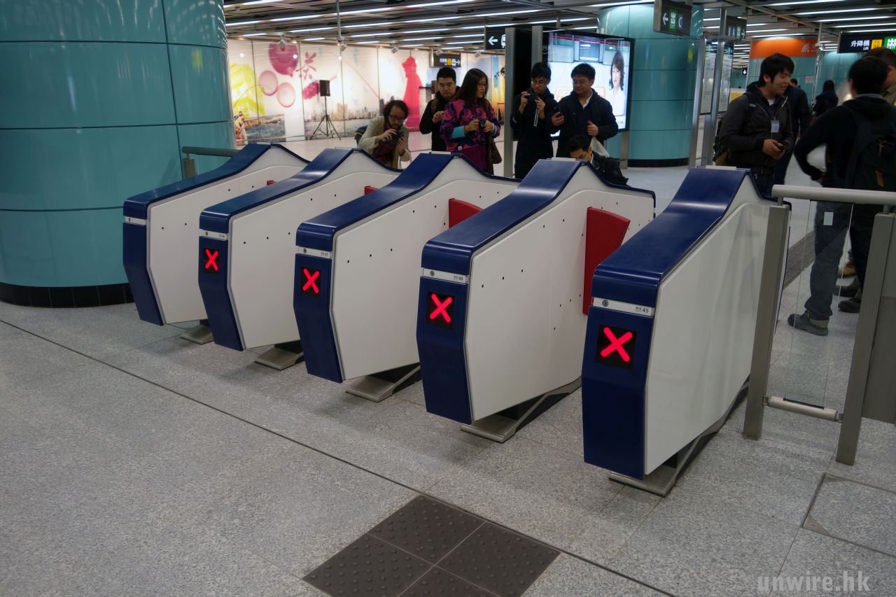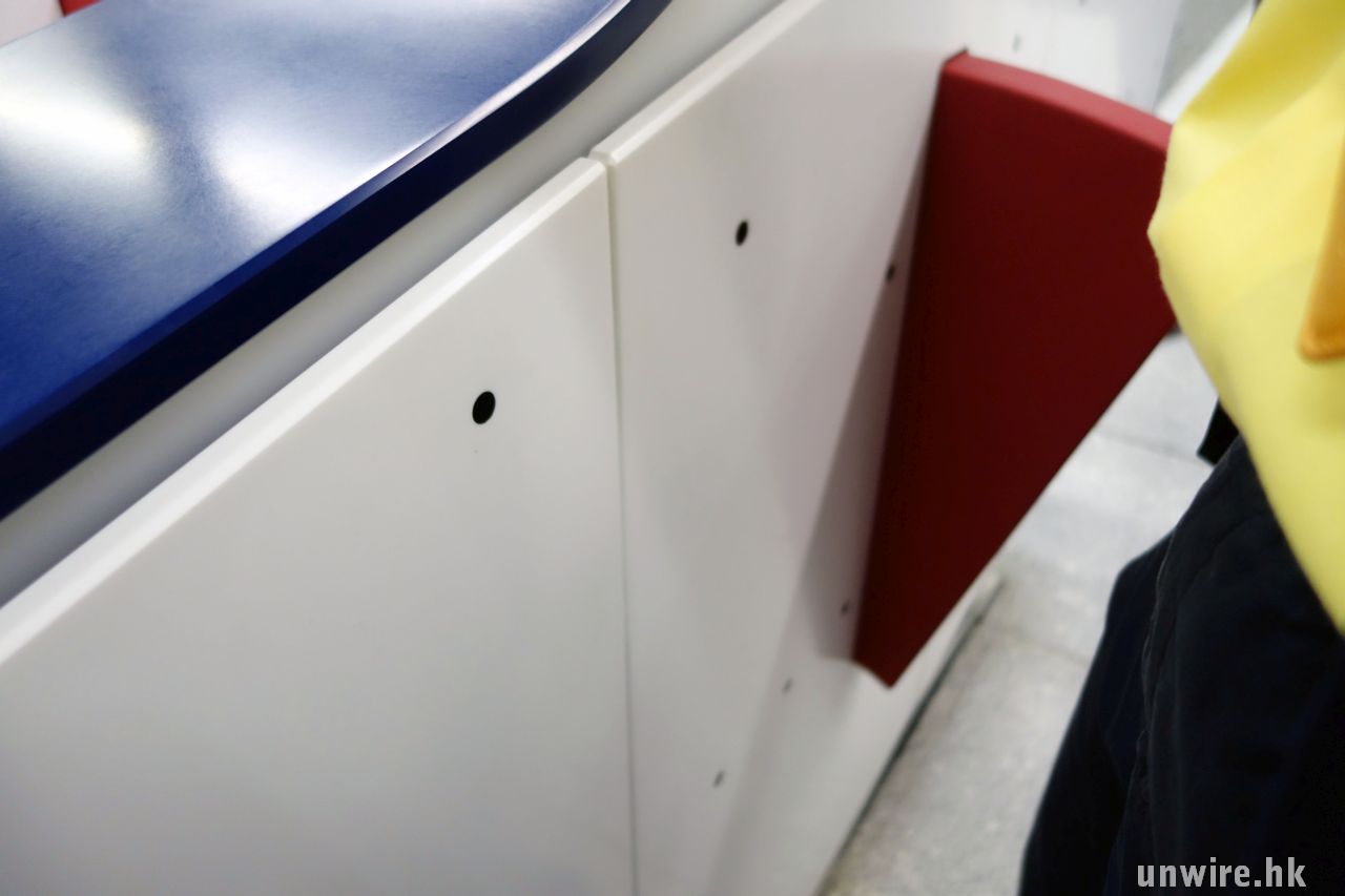 至於 3 個新站,就改用全新的閘機,用色為藍、白組合,與傳統港鐵站的銀色閘機唔同,感覺潮 D 但好似有 D 膠……如果大家有細心睇下面的相,應該會發覺閘機表面有好多黑色細點,其實個 D 都係紅外線感應器,如果感應有人通過,一來可以防止衝閘,二來前面的人過閘時,如果後面的人心急已嘟八達通,閘門就唔會關上,可以俾後面的人繼續出閘,加強繁忙時間過閘機的效率。據港鐵表示,其實現時舊閘機都有呢個設計,不過可能係新閘機採用白色面板,所以 D 黑點紅外線感應器會比較明顯而已。