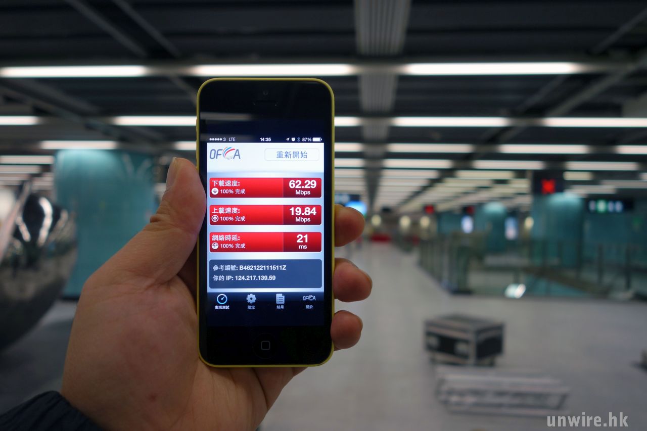 ▲但在大堂閘內相同位置,3HK 就收到 4G 訊號,而且下載、上載速度仲分別有 62.29Mbps 同埋 19.84Mbps ,好快。