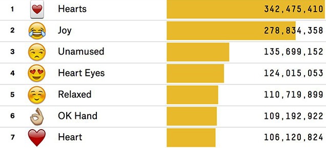 根據統計,心形撲克 Hearts 是最多人使用的的 Emoji,緊接其後的是 Joy 和 Unamused,至於心心眼 Heart Eyes、Relax、OK 手勢、紅心 Heart 和 Kissing Heart 都有過億的使用量。有興趣的讀者可以到 EmojiTracker.com 查看即時排名,不過網站載入時間很長,讀者要特別注意。