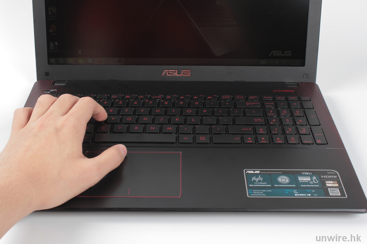 每次介紹 Gaming Notebook 小編 總覺得好似介紹「豪宅」咁,因為它們總是搭載獨特外形、金屬外殼或發光機身,當然咁樣係好「型」,但老實說識發光打機會順一點嗎?因此 Asus 這部 Y581JK 就定位為之前 G551JM 的入門版本,機身用了比較平實的膠製外殼,內外印迷宮似的紅色花紋,簡單得來又有 Gaming 風格。機內鍵盤按鍵用了黑底紅色,鍵盤有齊標準 Fn 鍵及 Numpad,但就冇背光,而 Touchpad 空間充足,手托亦加上凹凸紋防止「跣手」,設計就好似普通 Notebook 修飾過來,沒有太多花巧設計,感覺就好似「居屋」咁。