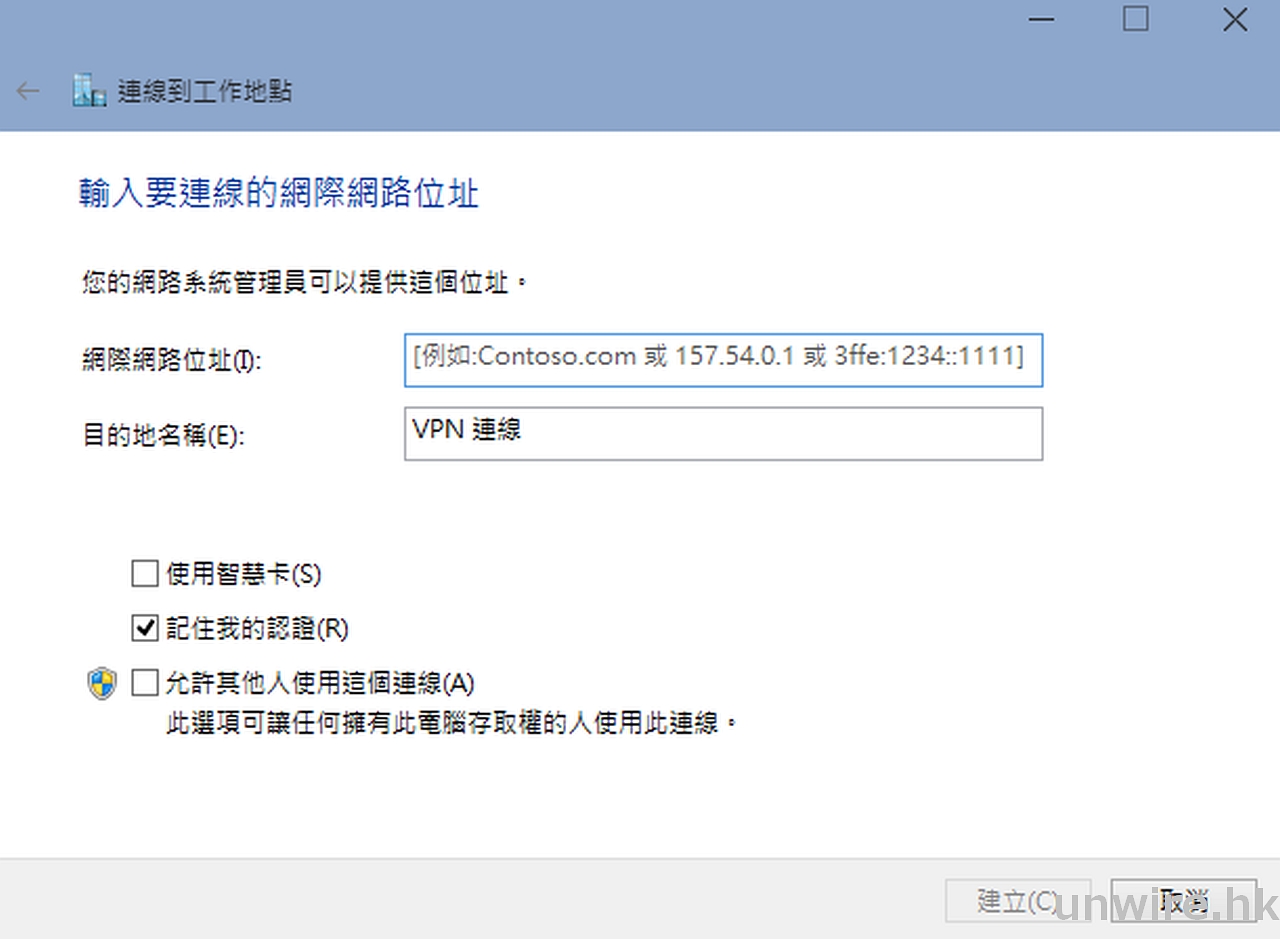 ▲設置完成後需在別的電腦,處於別的網絡來進行連線測試。於網絡和共用中心按「設定新的連線 …」並選擇「連線到工作地點」。