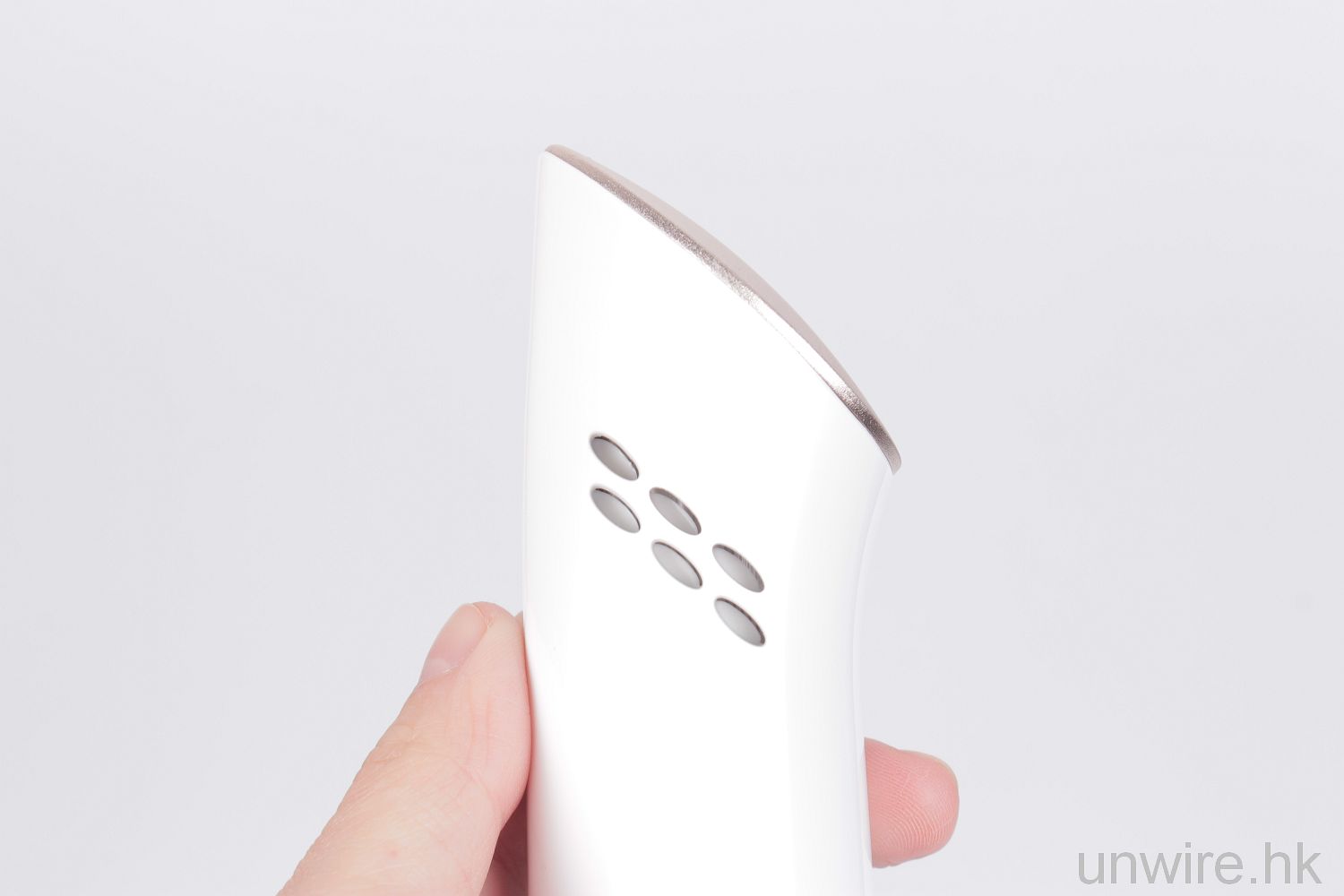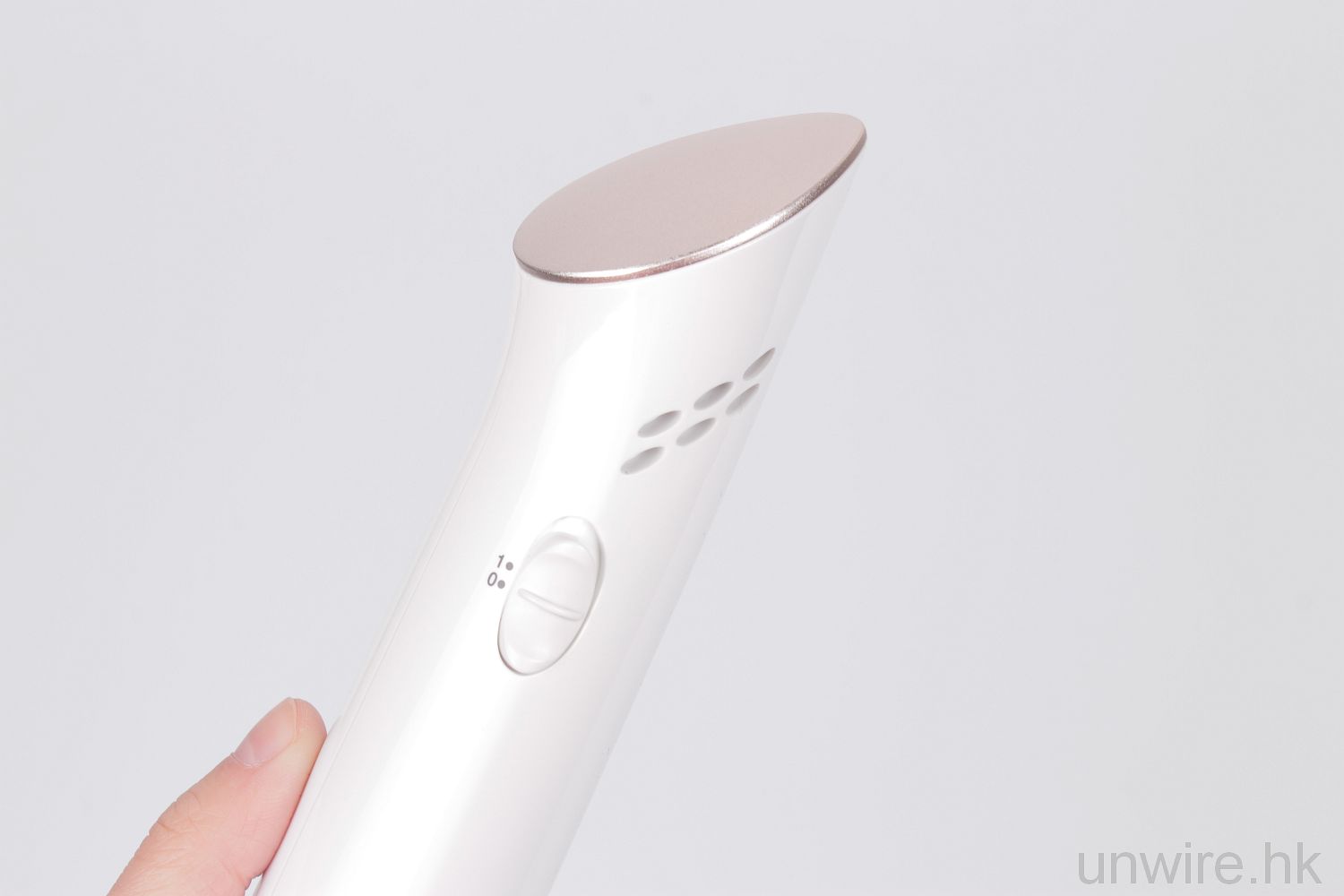 冰肌棒以白色為主色,配以玫瑰金色的冷敷板,只有一個開關按鈕,設計簡約、時尚。而直身設計,看下去以為會很滑手,原來又不是,它機身比較輕,用的時候也幾順手。唯獨需要插電使用,電源線也不算太長,下下要就著,也幾麻煩,不過市面上大部份有冷敷功能的美容機也是這樣,我看這個應該是技術的問題,也不能怪它啦!