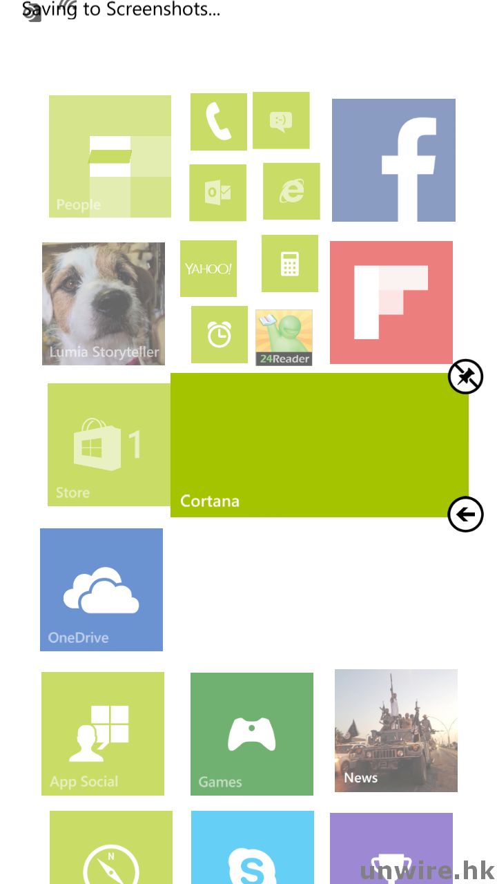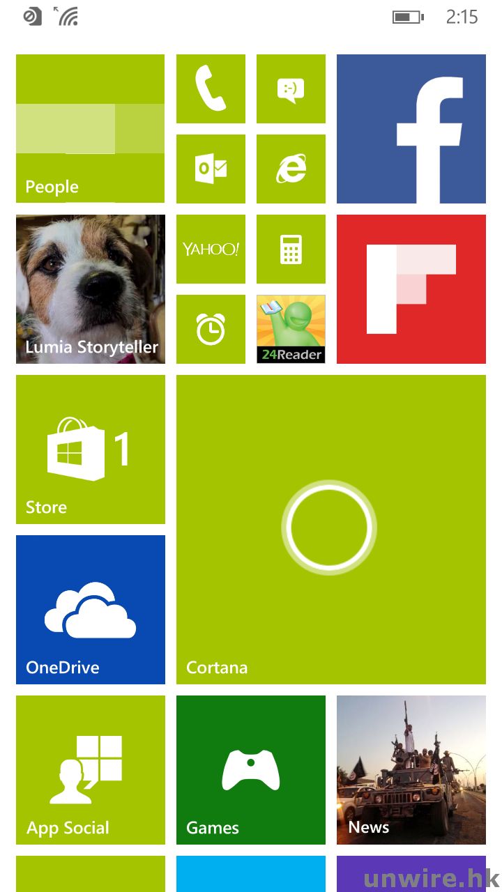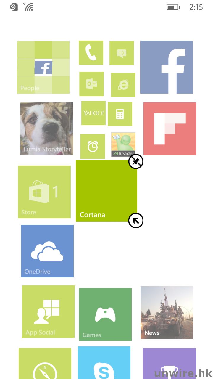 首先從首頁講起。Windows Phone 一向以來最大的特點,其中一項就係「動態磚(Live Tiles)」。去到 Windows Phone 8.1,已經有 1 x 1、2 x 2 同 4 x 2 俾大家揀;而係 Windows 10 手機版,就再加多一個選擇,就係 4 x 4,令大家可以將最重要嘅動態磚「最大化」。不過 Edward 暫時試過,預載程式只有 Cortana 同埋 People 可以支援最大嘅 4 x 4 動態磚。希望 Microsoft 在未來的 build 可以加入更多程式、甚至第三方程式都可以支援呢個 size 嘅動態磚,令大家設定主介面時更具彈性吧。