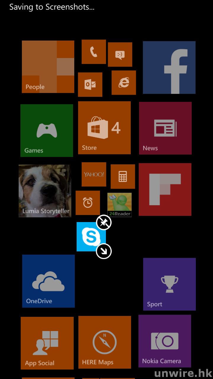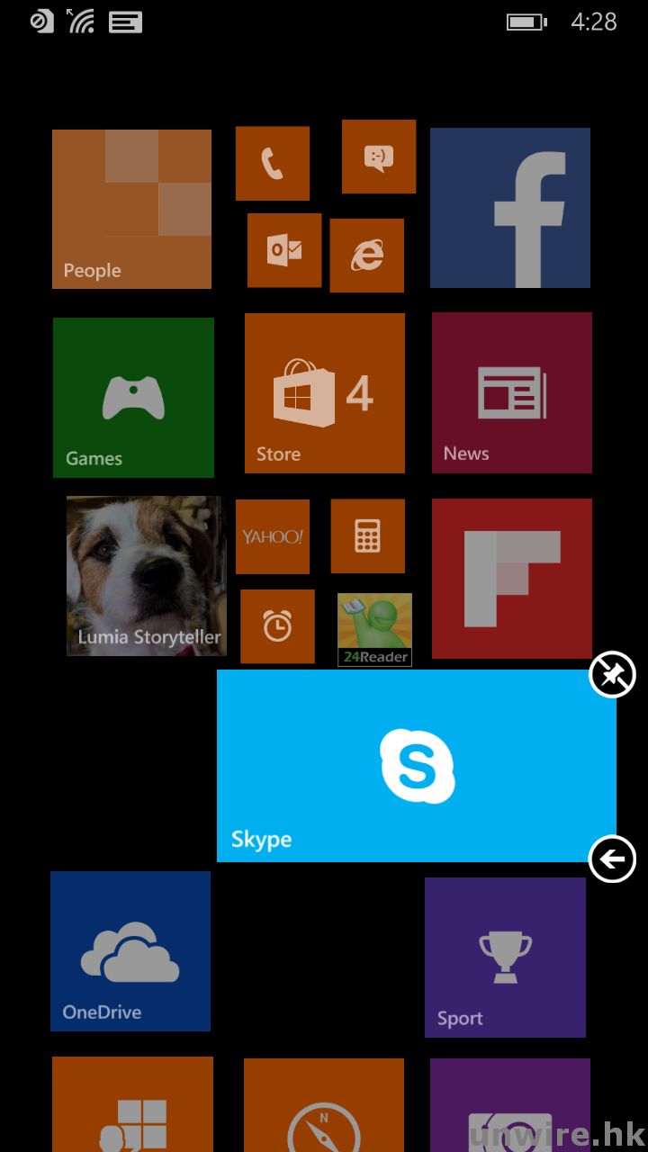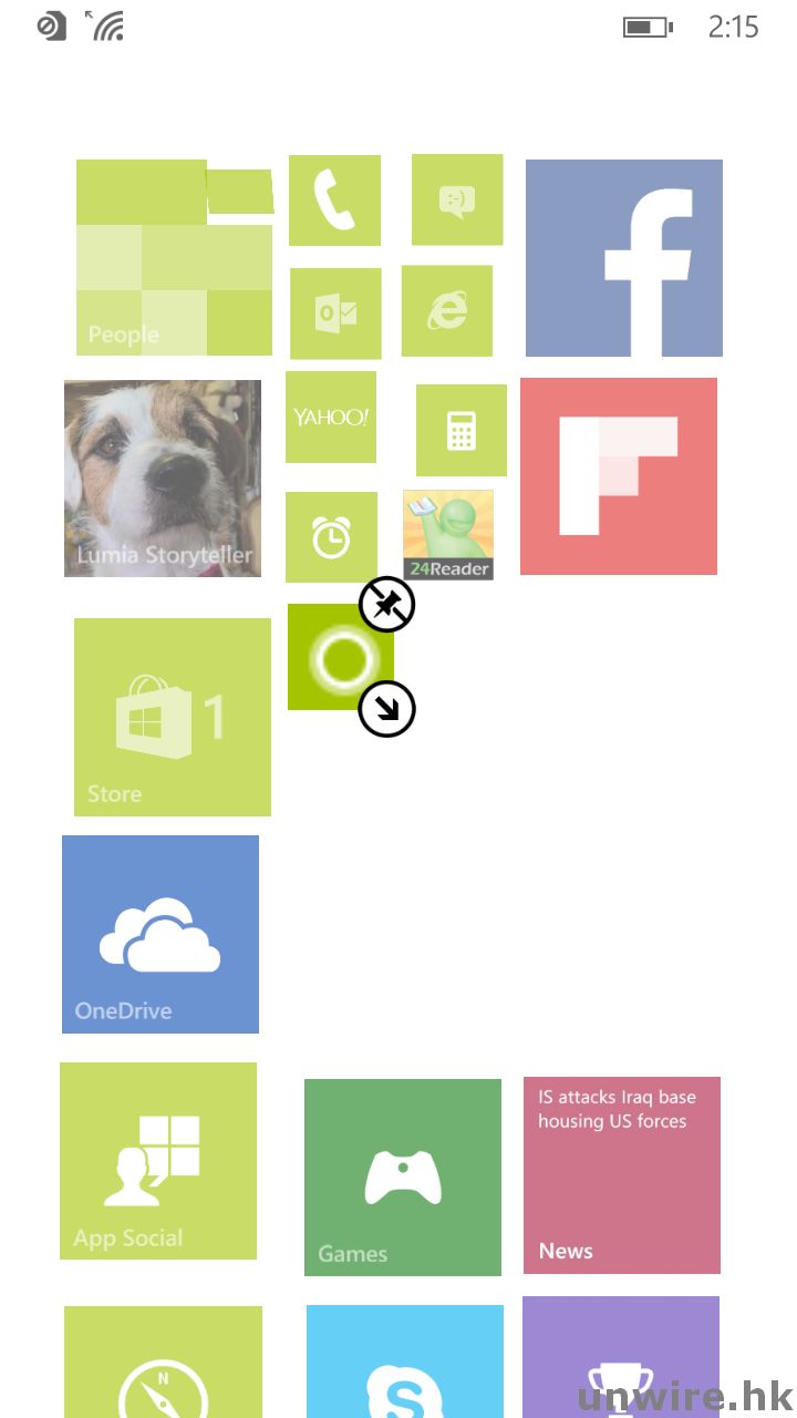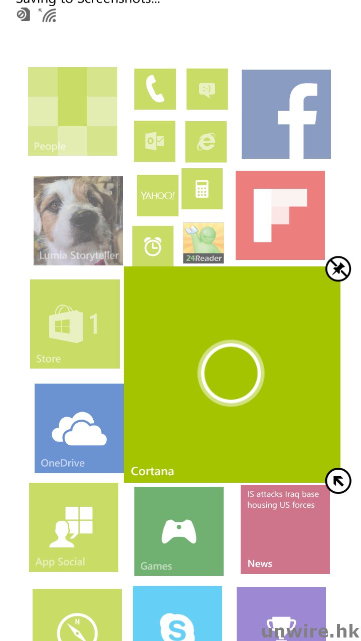 首先從首頁講起。Windows Phone 一向以來最大的特點,其中一項就係「動態磚(Live Tiles)」。去到 Windows Phone 8.1,已經有 1 x 1、2 x 2 同 4 x 2 俾大家揀;而係 Windows 10 手機版,就再加多一個選擇,就係 4 x 4,令大家可以將最重要嘅動態磚「最大化」。不過 Edward 暫時試過,預載程式只有 Cortana 同埋 People 可以支援最大嘅 4 x 4 動態磚。希望 Microsoft 在未來的 build 可以加入更多程式、甚至第三方程式都可以支援呢個 size 嘅動態磚,令大家設定主介面時更具彈性吧。