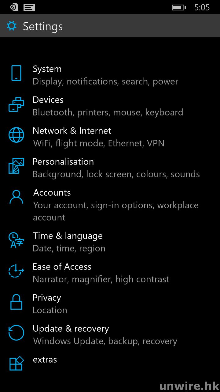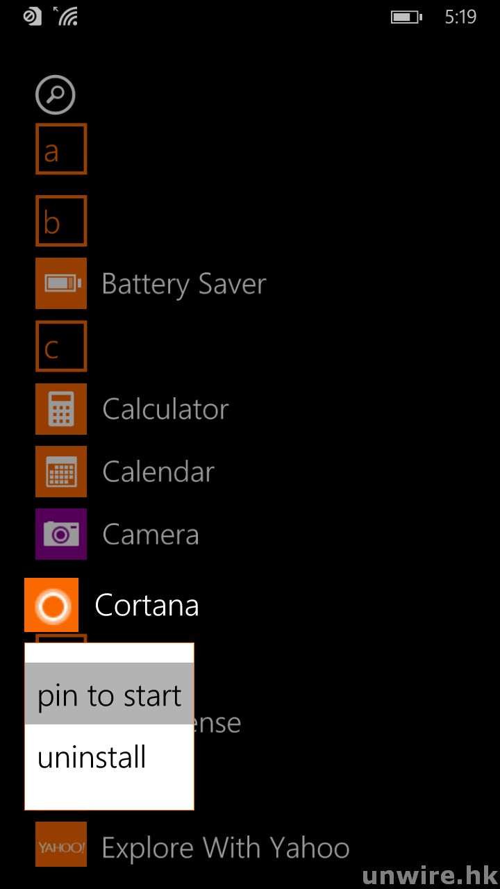 以前 Windows Phone 8.1 要 delete APP,往往要去番設定入面刪除;Windows 10 之後就容易得多,係 APP 列表入面禁實個 APP 名,然後揀 uninstall 就可以啦,同 iPhone、Android 係同一道理,甚至比部分 Android 手機更容易。不過 Windows 10 手機版彈出來嘅選項目錄,就變咗一個白底格,而唔係好似 Windows Phone 8.1 或之前嘅 OS 咁,「界」個白底目錄出來。邊個美觀啲?Edward 就覺得見仁見智,但我就比較鍾意舊嘅設計多少少。