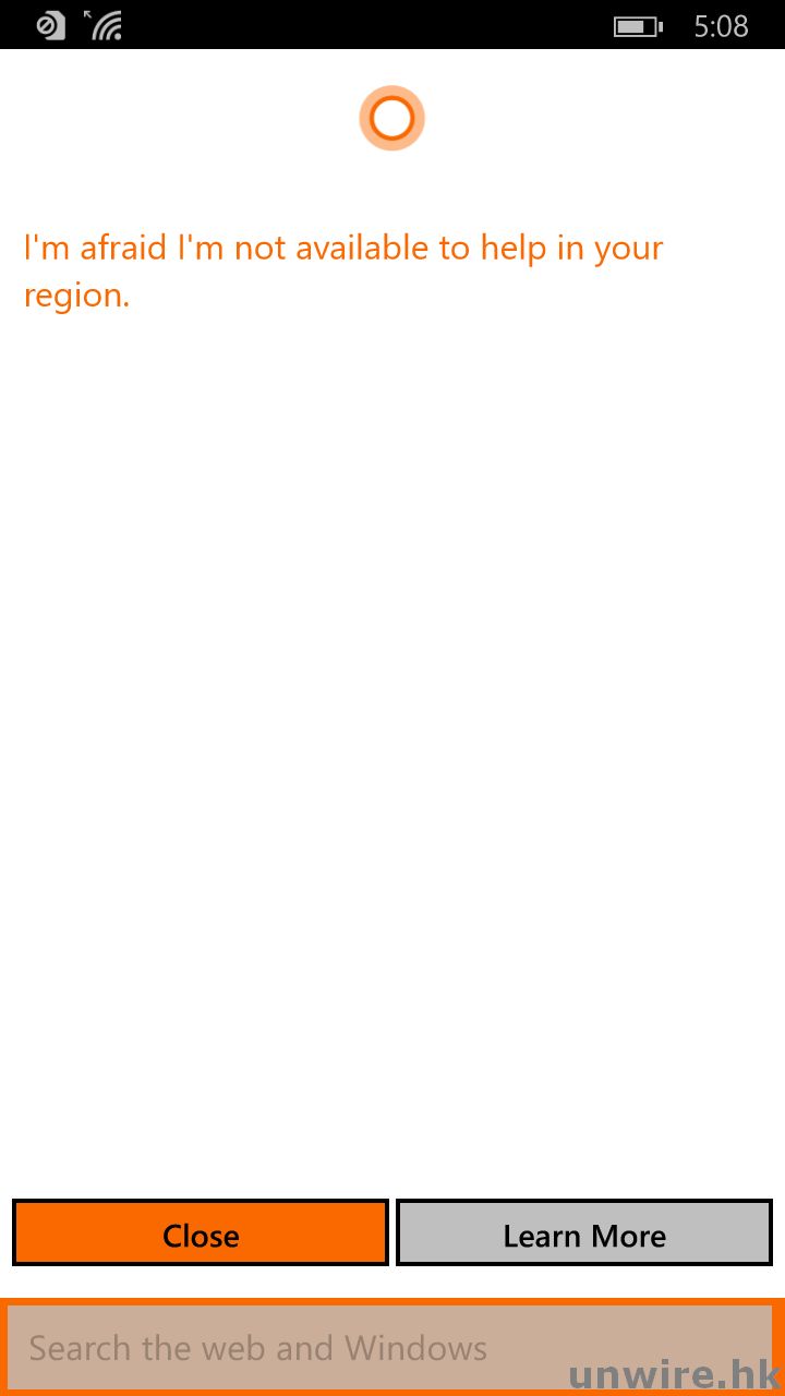而要測試 Cortana,亦首先要將地區同埋語言轉做英文(例如:English – United States),先至用得到,否則就會出現以下情況: