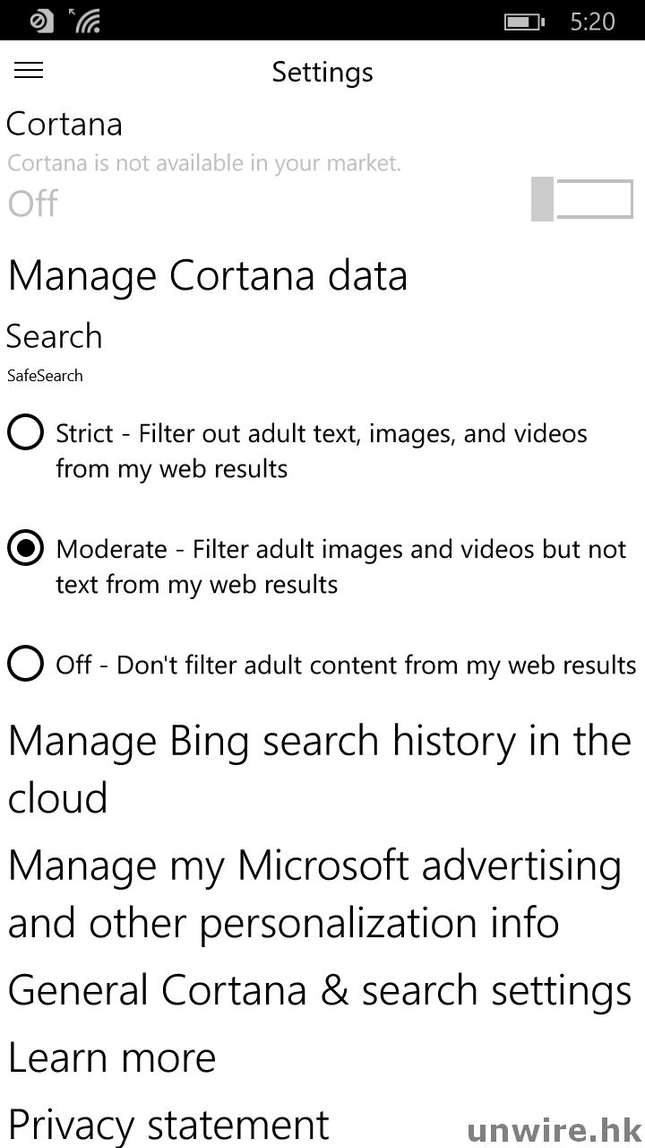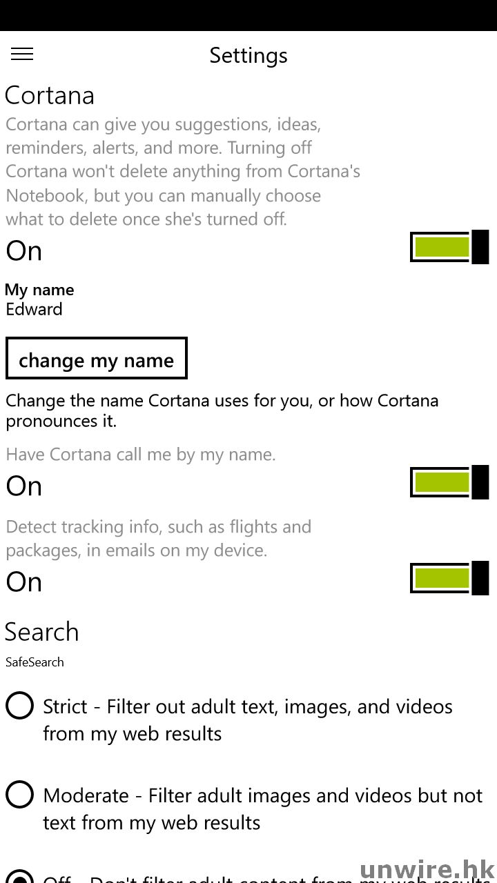之後就可以開始試玩 Cortana。在試玩之前,大家可以係設定入面選擇是否將「敏感字 / 內容」從搜尋結果中過濾掉,例如:粗口、成人內容(包括文字、相片、影片等),而為咗試盡佢,Edward 就選擇咗「Off」。另外,如果大家想 Cortana 從電郵中找出航班、旅行資料等內容,然後在使用 Cortana 搜尋時可以提醒自己,就記住要係設定入面開啟「Detect tracking info…….」選項。