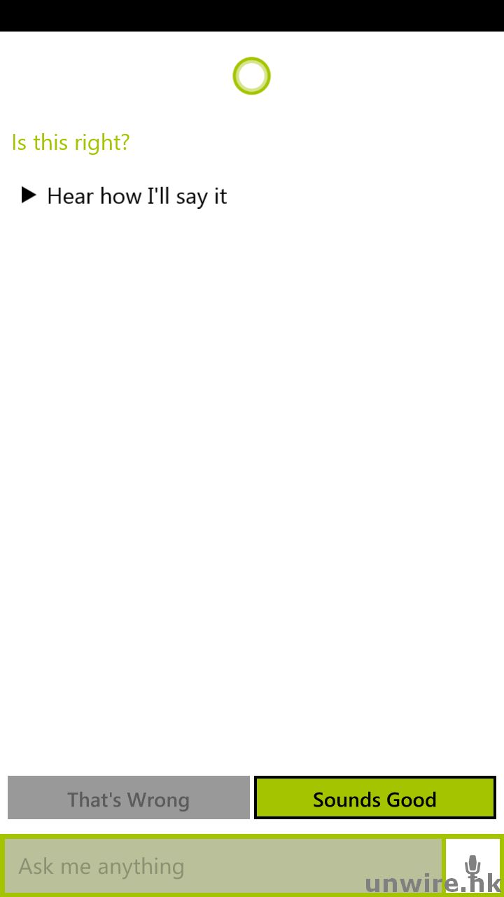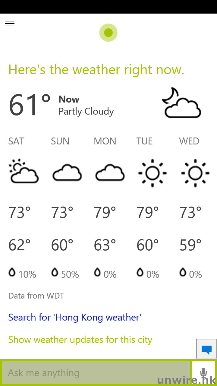 首先打個招呼:Hi sexy Cortana,佢回覆:「Hi there」,相當友善呢!