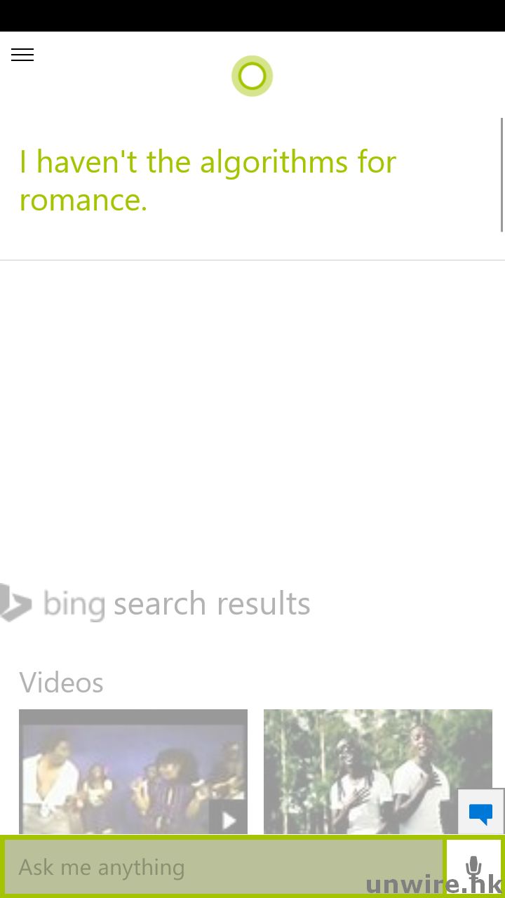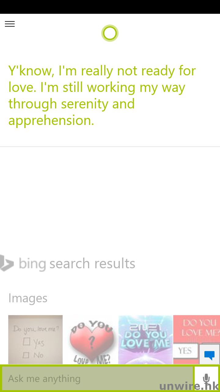 既然今日係情人節,就問佢:「Do you love me?」結果就當然係「食檸檬」啦,唉……不過 Cortana 拒絕我嘅表白都拒絕得型過人呢!