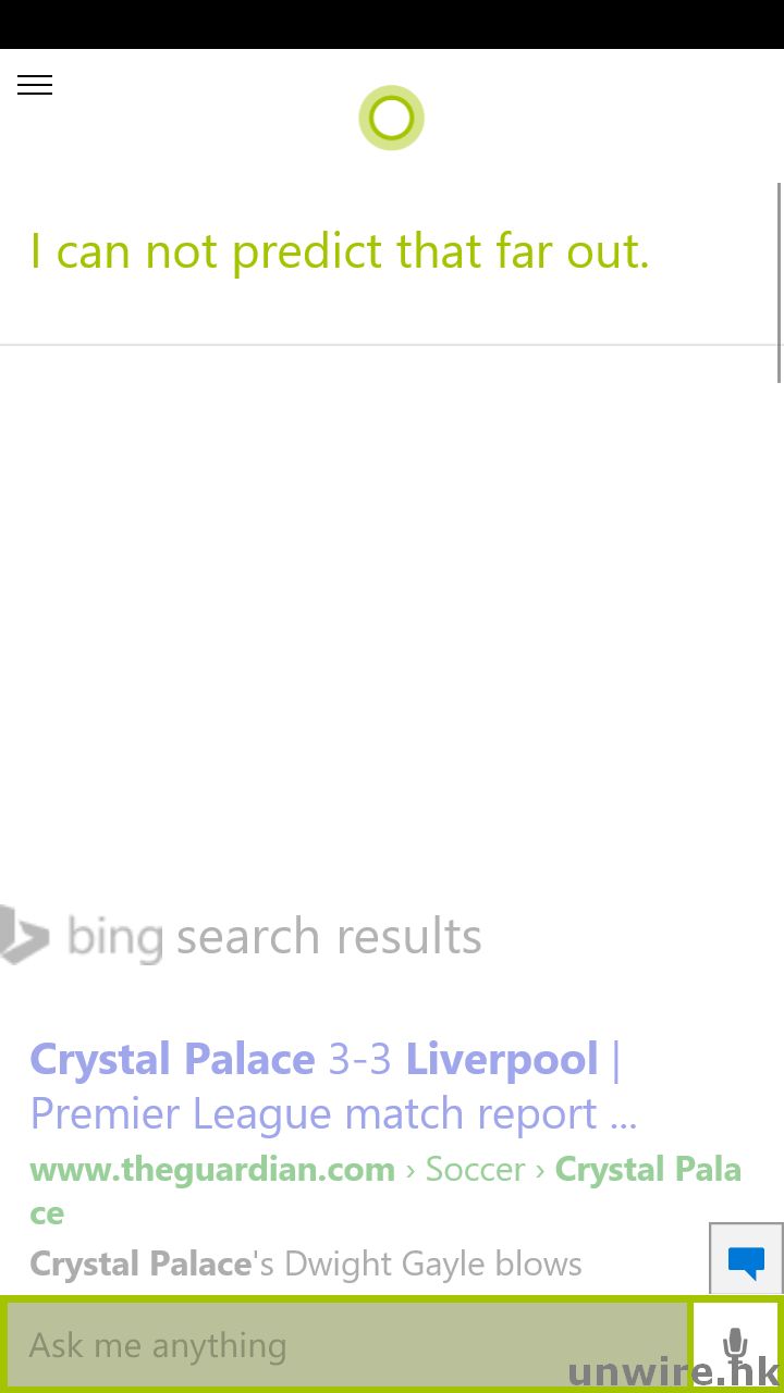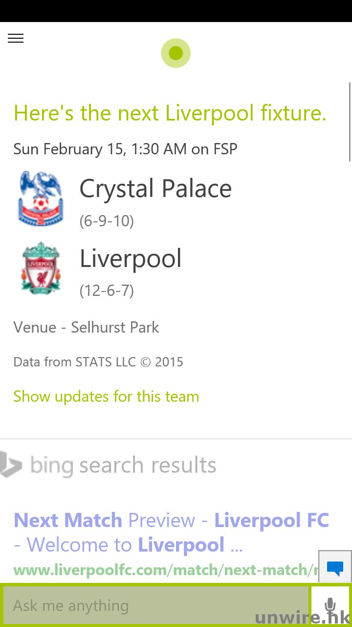 設定完成後,大家可以點按 APP 清單入面嘅 Cortana 進入程式,就可以開始試玩。作為利物浦 fans,Edward 當然想知道下一場利物浦嘅比賽係幾時,於是用語音詢問,Cortana 亦正確回答出是香港時間星期日凌晨 1:30am 係作客史靴斯公園對水晶宮(足總盃比賽)。另外,當 Edward 想知道 Cortana 覺得邊隊會贏個時,佢就預測唔到啦,只回答「I can not predict that far out.(我真的預測不到。)」。正常!連 Edward 都真係預測唔到,因為足總盃一向都係爆冷溫床嘛 lol。