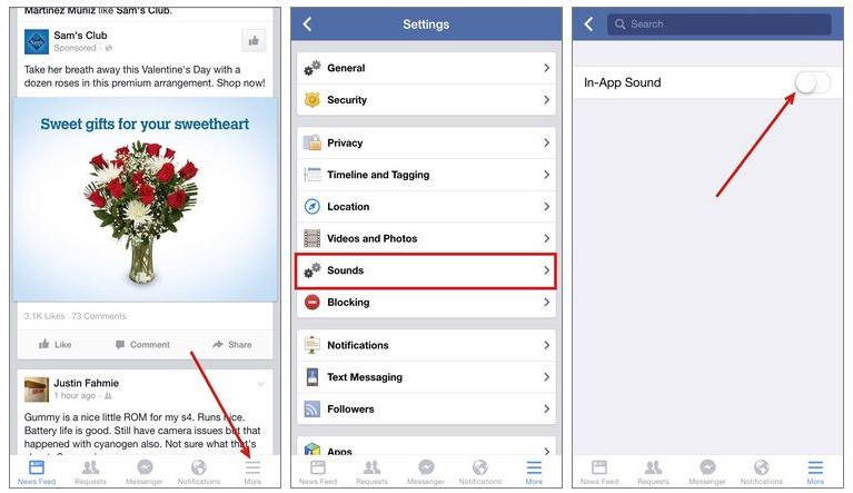 在 iOS 版的 Facebook 右下角,點一下 More,然後選擇 Settings;再在 Sounds 內將 In-App