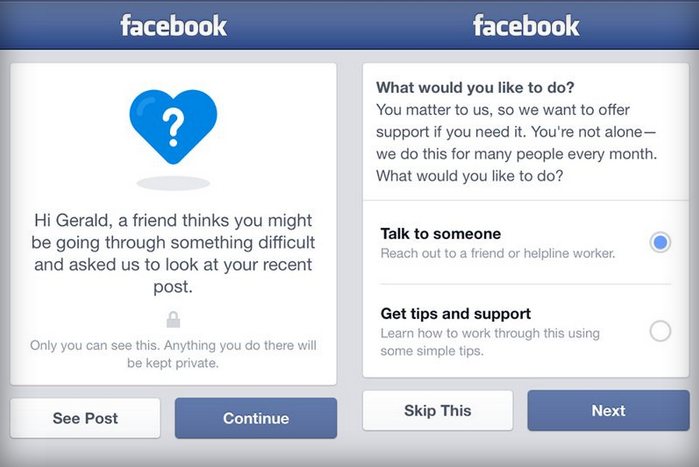 Facebook 會和美國多間精神健康機構合作,當發現和自殺自毀有關的內容更新,Facebook 會鼓勵用戶嘗試和防止自殺機構的專家傾談,他們會提供建議和支援,協助解決和渡過難關。向 Facebook 舉報的用戶亦會取得類似的求助熱線資訊,並鼓勵他們致電或發訊息給朋友,以拯救寶貴的性命。