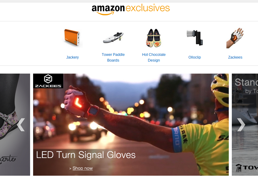 雖然服務叫作 Amazon Exclusives,實際上產品並非完全「獨家」只在 Amazon 出售。賣家還可以在一般零售店和自家網站售賣物品,只是網店銷售權就要歸 Amazon 所有。現時在 Amazon Exclusives 發售的物品包括在 Kickstarter 大受歡迎的 Jackery 手機充電器、Zackees 聰明單車手套、Olloclip 相機鏡頭等。