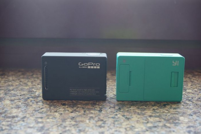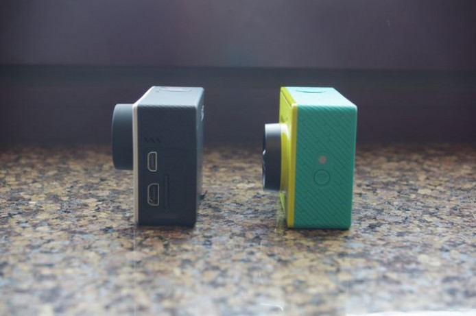 乍看下兩者的尺碼相近,然而由於鏡頭、按鍵與 I/O 位置完全不同,從中間看小蟻運動相機的位置在中心偏右方,而 Hero 4 的鏡頭則是上方偏右,此外小蟻的尺寸也略高了一些;另外 Hero 4 的 I/O 在側面,但小蟻則是把無線傳輸鍵配置於此;小蟻另將 I/O 配置在機背,且採用可換電池設計。
