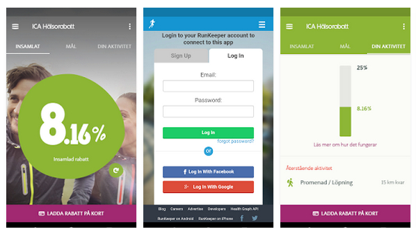 瑞典人對於跑步鍛煉非常熱衷,超市集團 ICA 於是推出手機 App。超市會員只要在跑步時先啟動手機 App,每跑 1 公里就有 0.5% 折扣,最多可以獲得 25% 折扣去購買超市指定的健康或有機食品。對於每天都會跑步鍛煉的人,跑步健身同時獲得超市優惠,可算是一舉兩得。
