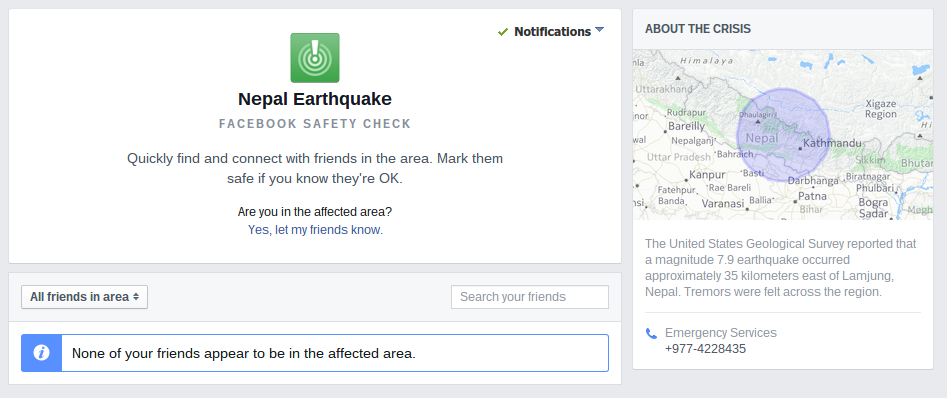 Facebook 的 Nepal Earthquake Safety Check 讓網民報平安,網民可以在 Facebook 通知家人自己安全或不在受災地區。Google 則推出 People Finder 網頁,網民可以在上面發佈尋找的對象,或者分享其他尋人訊息,除了電腦或手機網站,People Finder 還有 SMS 查詢功能。
