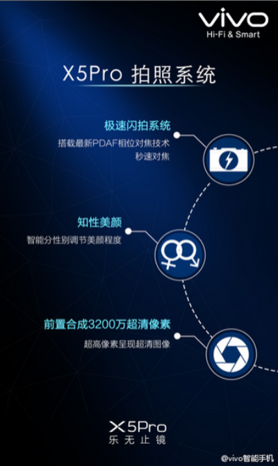 至於另一張宣傳圖片則講述 X5Pro 的拍攝細節。根據資料顯示,該款新手機的前置鏡頭將可以合成出高達 3,200 萬像素的影像,而有關技術現時已經在 Oppo Find 7 的後置鏡頭上出現,不過 X5Pro 則應用在自拍鏡頭上。此外,X5Pro 的拍攝系統同時還具備美顏及極速對焦的閃拍功能,而後置鏡頭方面則會有相位偵測自動對焦功能。